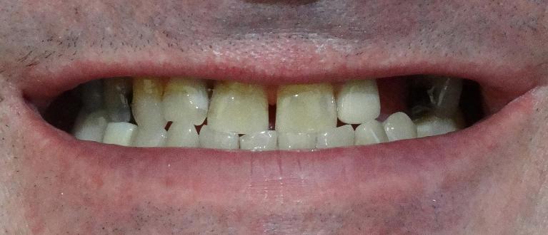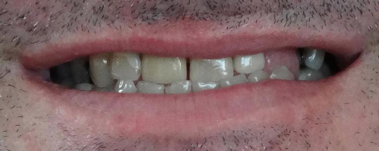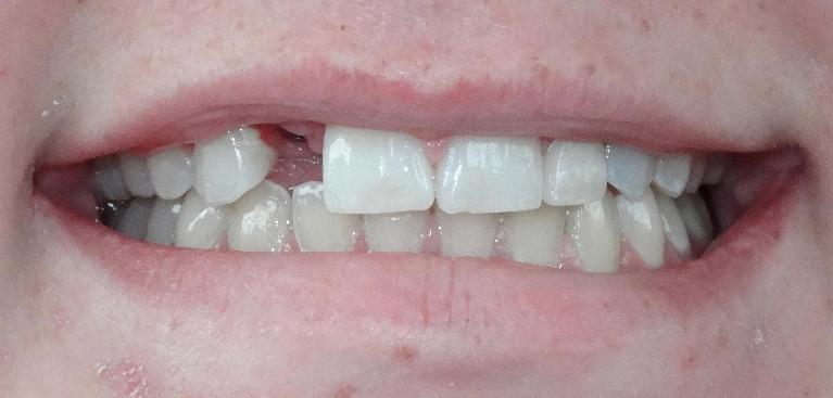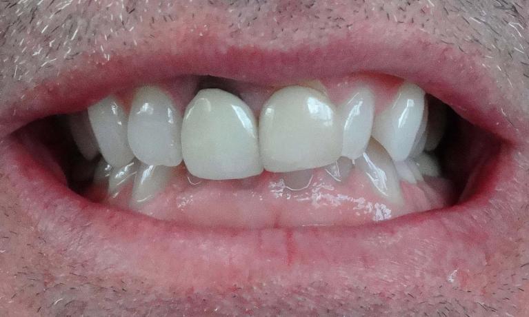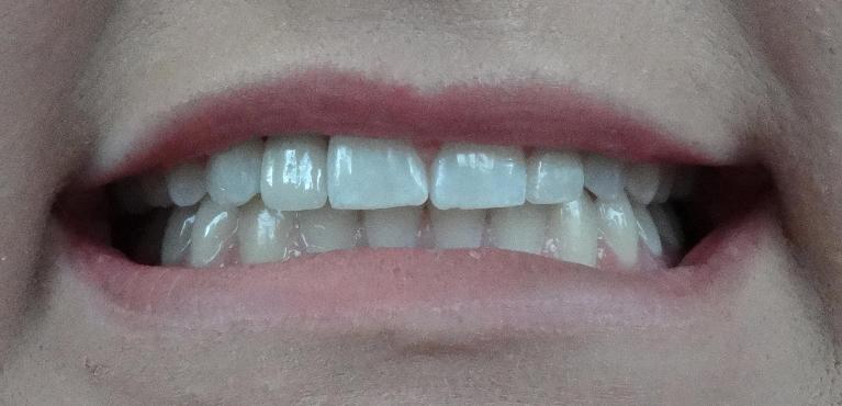 This patient disliked their "black triangle", a space that is normally filled by gum tissue has a void instead. These areas can trap food, appear to be debris stuck in teeth, or let saliva sneak out while speaking. It was fixed in a single appointment, with zero removal of existing enamel and no damage to their teeth.