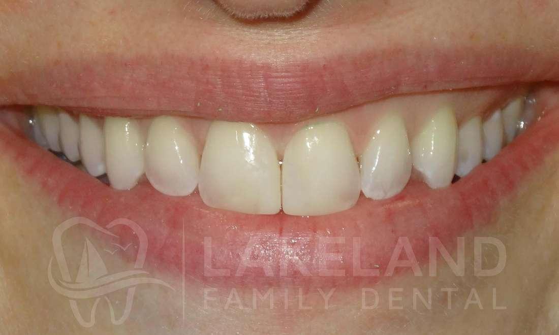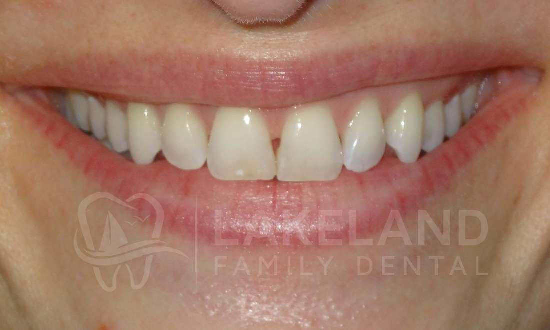 A "black triangle" is when there is an open space instead of gum tissue filling the area in. This space was closed in a single visit with no anesthetic, and no damage to the front teeth!
