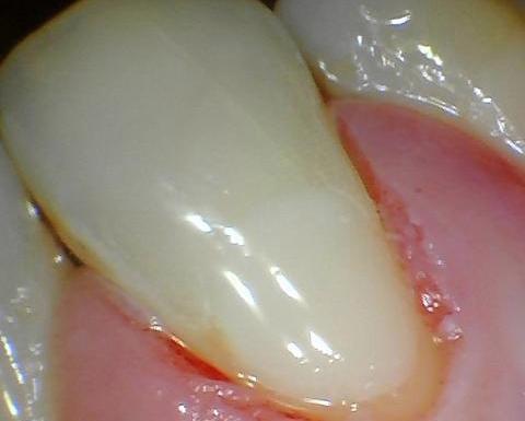 This patient had a cavity along the gumline of this tooth, which was repaired with a tooth colored filling.