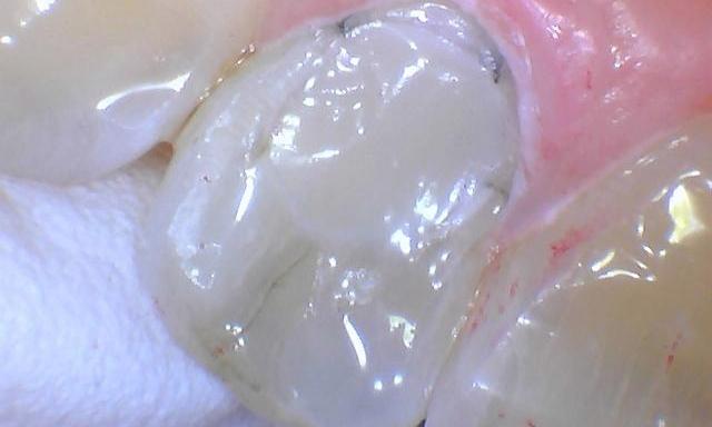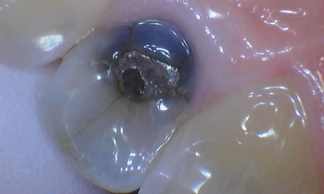 This patient had an old amalgam "silver filling" that was experiencing leakage and was turning the surrounding tooth dark gray. The old filling,(along with the cavity starting underneath) was removed and replaced with a tooth colored filling.